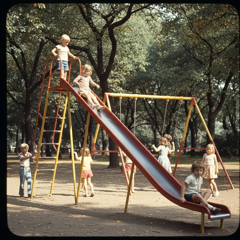 Everything was metal. Slides that reached third-degree burn temperatures by noon. Monkey bars that knocked out teeth. Merry-go-rounds that launched kids like medieval siege weapons.