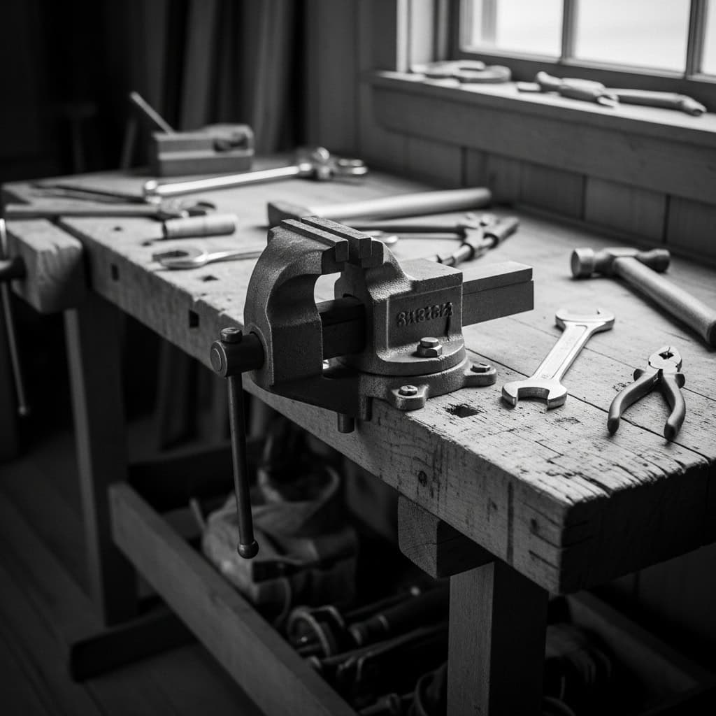 The bench vise tells a similar story. Jaws that could hold a locomotive. Quick-release that actually released quickly. Cast iron so thick you could use it as an anvil. And many did.