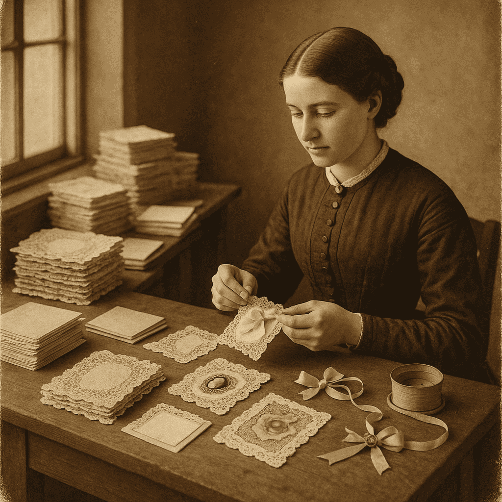 Howland set up an all-female assembly line in her home. Each woman had one job: cut the lithographs, paste the backgrounds, attach the lace, insert the colored wafers.