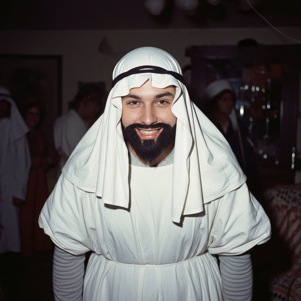 So naturally, we dressed our kids as oil sheikhs. Towels on heads. Painted-on beards. Sometimes carrying toy oil barrels.