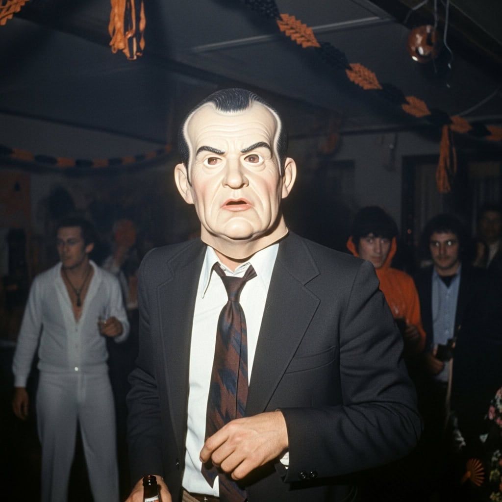 And we dressed our children as a disgraced president for laughs. Tiny criminals in suits, holding tape recorders, yelling “I am not a crook!”