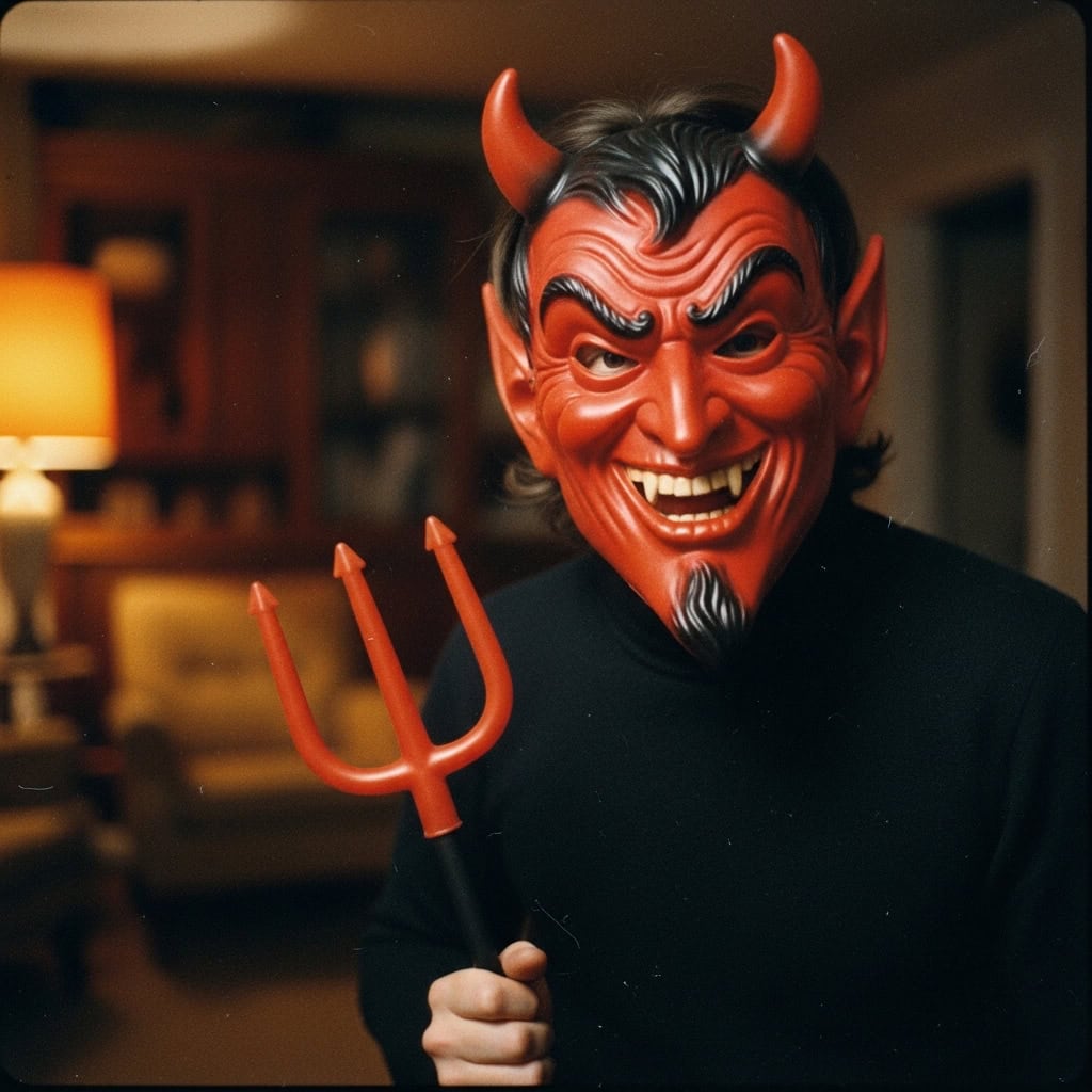 That red plastic face with the elastic band that snapped halfway through the night. The pitchfork that broke before you left the house.