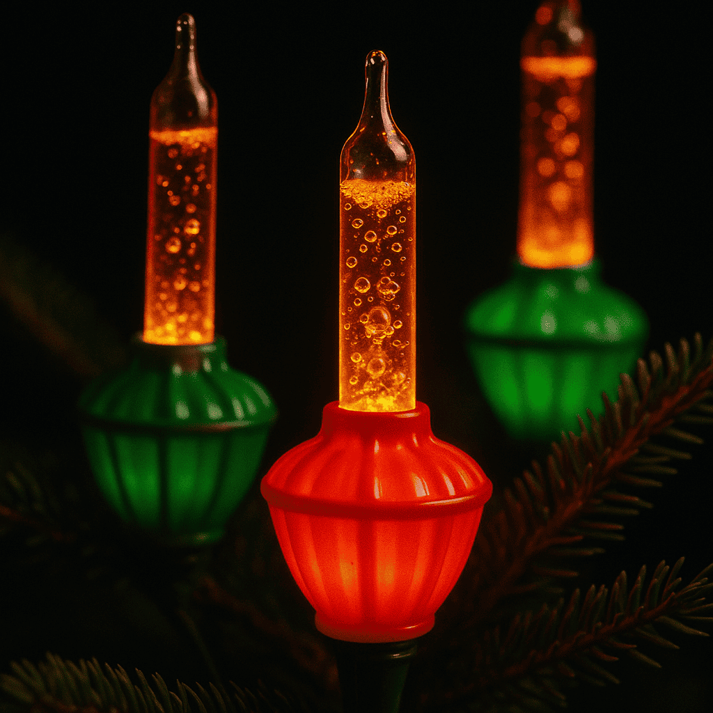 You had bubble lights—glass tubes filled with liquid that literally boiled when heated by the bulb below. Streams of bubbles rose frantically through red, blue, and green columns.