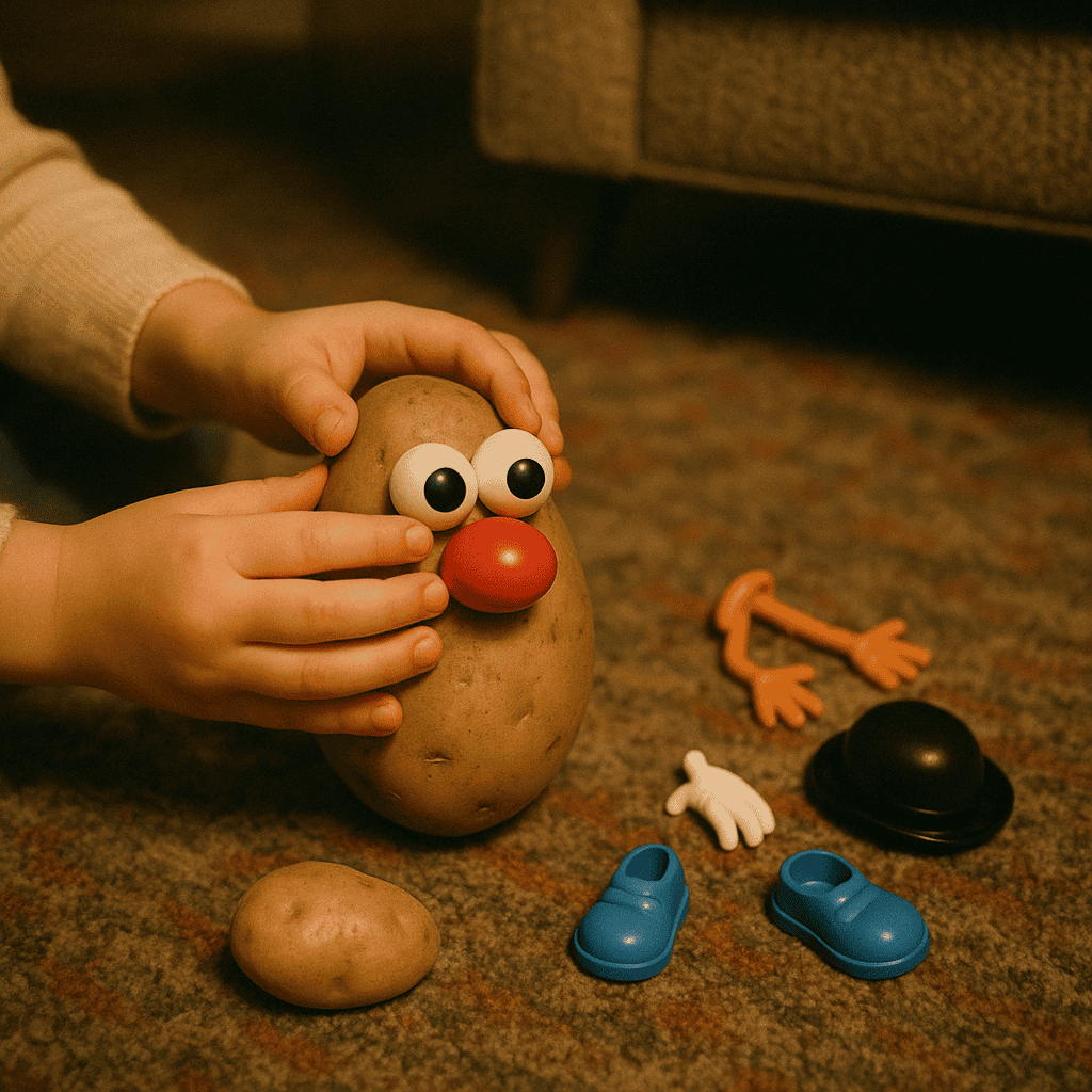 You used an actual potato from the kitchen. The kit just had the face pieces—eyes, ears, nose, mouth—all with sharp little prongs you’d stick right into a real spud.
