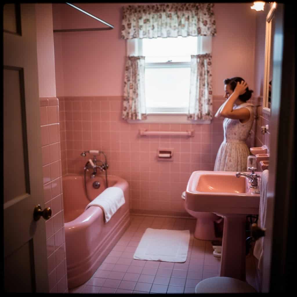 Pink tile. Mint green sink. One bathroom shared by everyone.