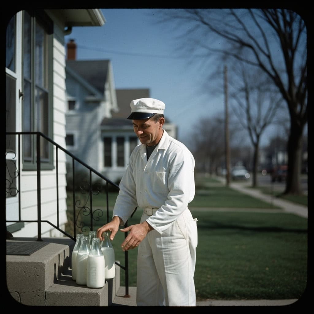 The milkman didn’t just deliver—he was part of the neighborhood fabric, trusted enough to walk right up while you slept.