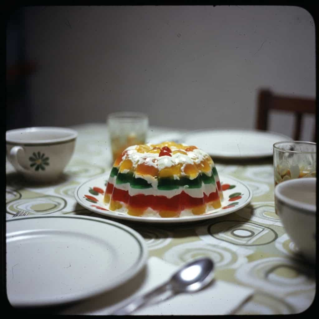 Lime Jell-O. Cottage cheese. Fruit suspended like it defied gravity. Maybe some shredded carrots for texture.
