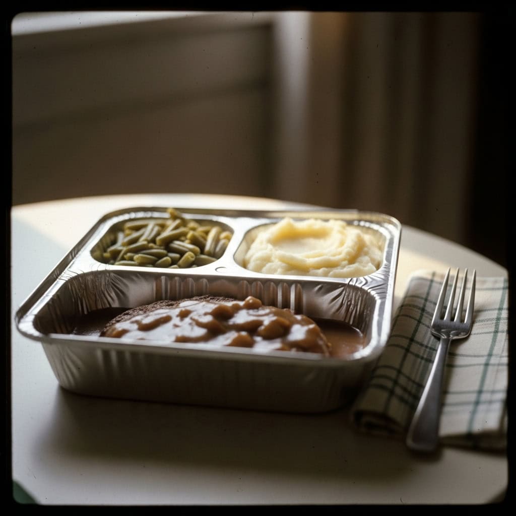 Ninety-eight cents bought you a complete meal. Salisbury steak, peas, mashed potatoes—all in separate compartments.
