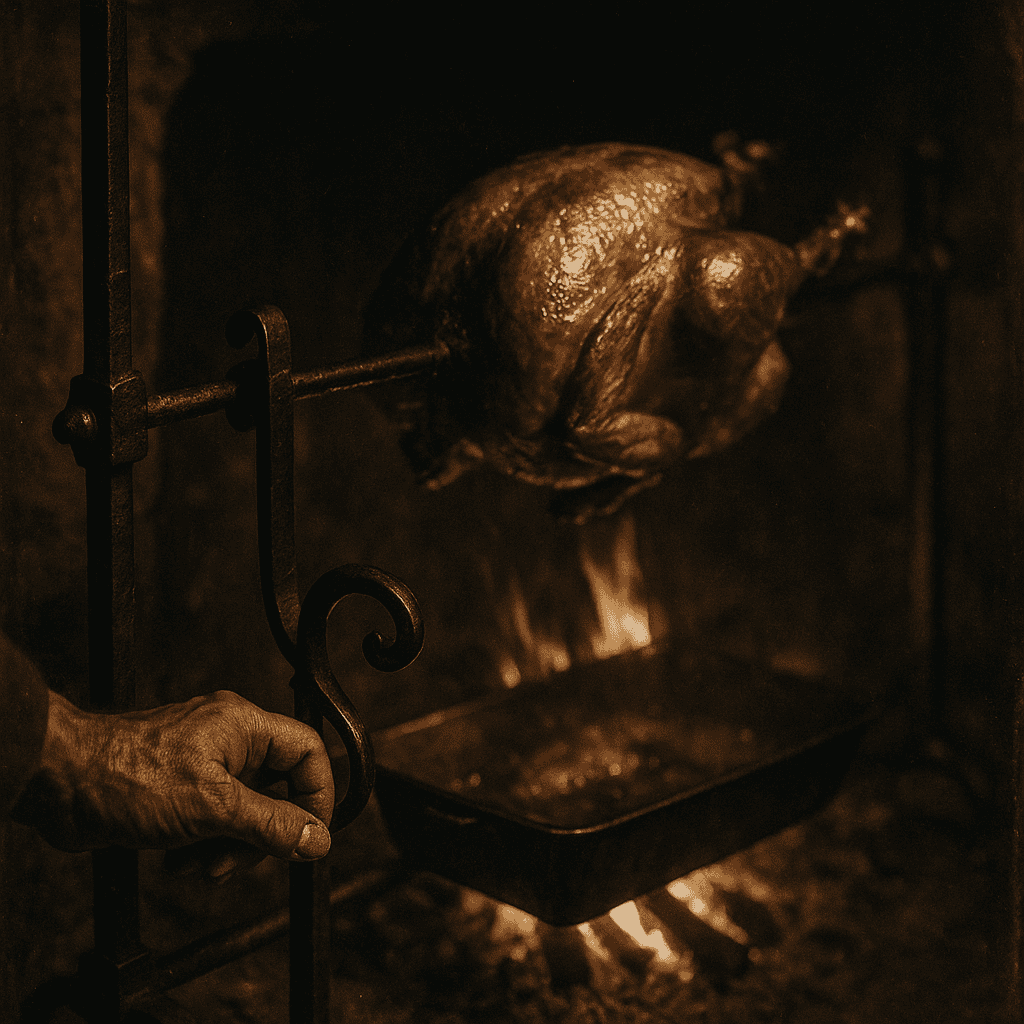 The turkey or goose went on a metal spit in front of the fire—not over it, in front of it. There was a special reflector oven called a “tin kitchen” that sat on the hearth and bounced heat onto the meat.