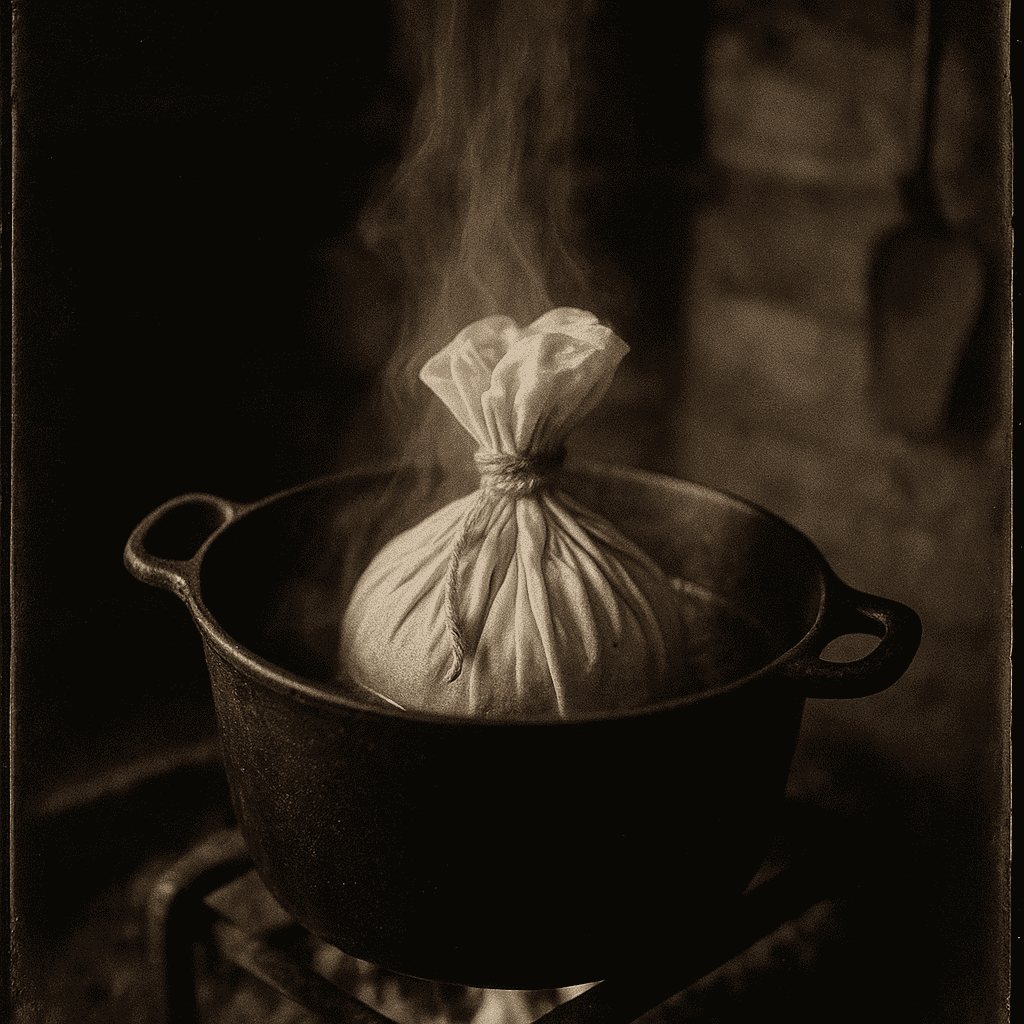 If the cloth wasn’t tied tight enough, water seeped in and turned it to mush. If the pot boiled dry, the cloth burned and the pudding was ruined. If the cloth burst during boiling, you had pudding soup.